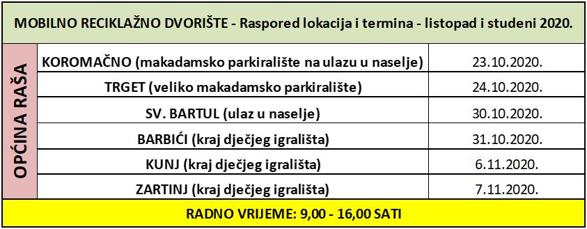 Mobilno reciklažno dvorište biti će postavljeno u petak (30.10.2020.) u Sv. Bartulu na ulazu u naselje. Dan kasnije (subota) seli u Barbići (kod spomenika). Radno vrijeme je od 9,00 do 16,00 sati. Kraj MRD-a dežura radnik 1.MAJ-a, pa je upotreba MRD-a vrlo jednostavna. Ujedno, predaja otpada je besplatna. Napominjemo da nije dopušteno nositi miješani komunalni otpad iz kućanstva. Dopušteno je odložiti krupni otpad iz kućanstva, veće komade plastike i kartona, namještaj, kućanske uređaje, zrcala, staklo, žarulje, otpadna ulja, stare baterije, gume, opasne ambalaže i sl. Idući tjedan MRD će posjetiti Kunj i Zartinj.