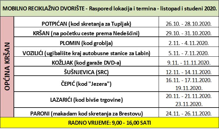 Mobilno reciklažno dvorište biti će postavljeno od ponedjeljka do srijede (2.-4.11.2020.) u Plominu kraj groblja. Radno vrijeme je od 9,00 do 16,00 sati. Kraj MRD-a dežura radnik 1.MAJ-a, pa je upotreba MRD-a vrlo jednostavna. Ujedno, predaja otpada je besplatna. Napominjemo da nije dopušteno nositi miješani komunalni otpad iz kućanstva. Dopušteno je odložiti krupni otpad iz kućanstva, veće komade plastike i kartona, namještaj, kućanske uređaje, zrcala, staklo, žarulje, otpadna ulja, stare baterije, gume, opasne ambalaže i sl. U nastavku tjedna mobilno reciklažno dvorište seli u Vozilići.
