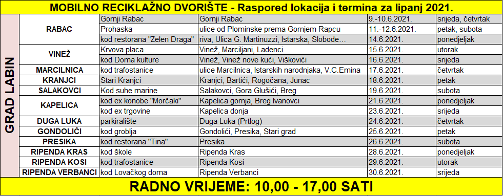 Mobilno reciklažno dvorište (MRD) u srijedu (23.6.2021.) biti će postavljeno u Kapelici, kod bivše trgovine. Radno vrijeme je od 10,00 do 17,00 sati. Kraj MRD-a dežurati će i radnik 1.MAJ-a.