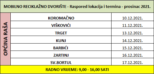 Mobilno reciklažno dvorište (MRD) je danas (14.12.2021.) postavljeno u Kunju, i to kod dječjeg igrališta. Sutra (15.12.2021.) će biti postavljeno u Barbićima.