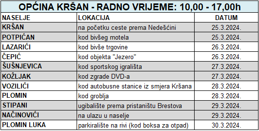 Mobilna reciklažna dvorišta (MRD) u ponedjeljak (25.3.2024.) biti će postavljena u Kršanu (na početku ceste prema Nedešćini) i Potpićnu (kod motela). Radno vrijeme je od 10,00 do 17,00 sati. Kraj MRD-a dežurati će i radnik 1.MAJ-a.