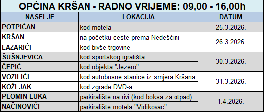 Mobilna reciklažna dvorišta (MRD) u proljetnom su obilasku područja Općine Kršan. Tako će u ponedjeljak (30.3.2026.) biti postavljeni u Šušnjevici (kod sportskog igrališta – boćališta) i Čepiću (kod objekta “Jezero”). Radno vrijeme je od 9,00 do 16,00 sati, a za građane je predaja otpada besplatna.