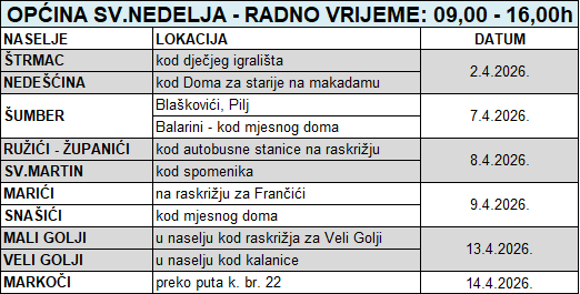 Mobilna reciklažna dvorišta (MRD) stižu na područje Općine Sv. Nedelja početkom travnja. Tako će u četvrtak (2.4.2026.) biti postavljena u Nedešćini (na makadamu kod Doma za starije) i Štrmcu (kod dječjeg igrališta). Radno vrijeme je od 9,00 do 16,00 sati, a za građane je predaja otpada besplatna.