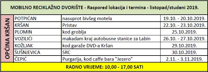 Mobilno reciklažno dvorište (MRD) biti će postavljeno ove srijede (30. listopad) u Šušnjevici, i to kraj SRC-a. Radno vrijeme je od 10,00 do 17,00 sati. Kraj MRD-a dežurati će i radnik 1.MAJ-a. Predaja otpada na MRD-u je besplatna, a građani mogu donijeti krupni otpad iz kućanstva, veće komade plastike i kartona, namještaj, kućanske uređaje, zrcala, staklo, žarulje, otpadna ulja, stare baterije, gume, opasne ambalaže i sl. U subotu i nedjelju posjetiti ćemo i Čepić, a time završava i ovaj jesenski obilazak teritorija Općine Kršan.